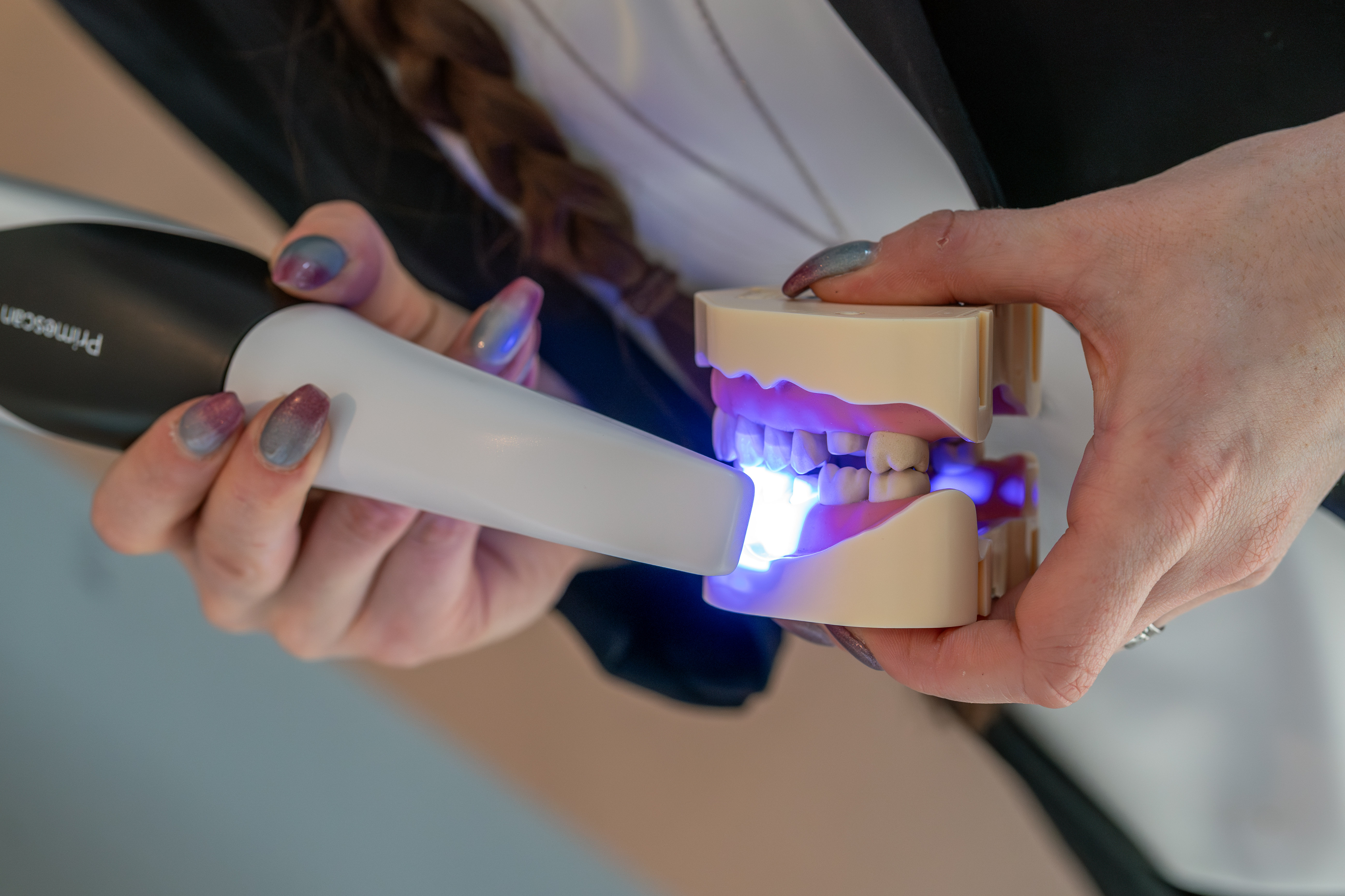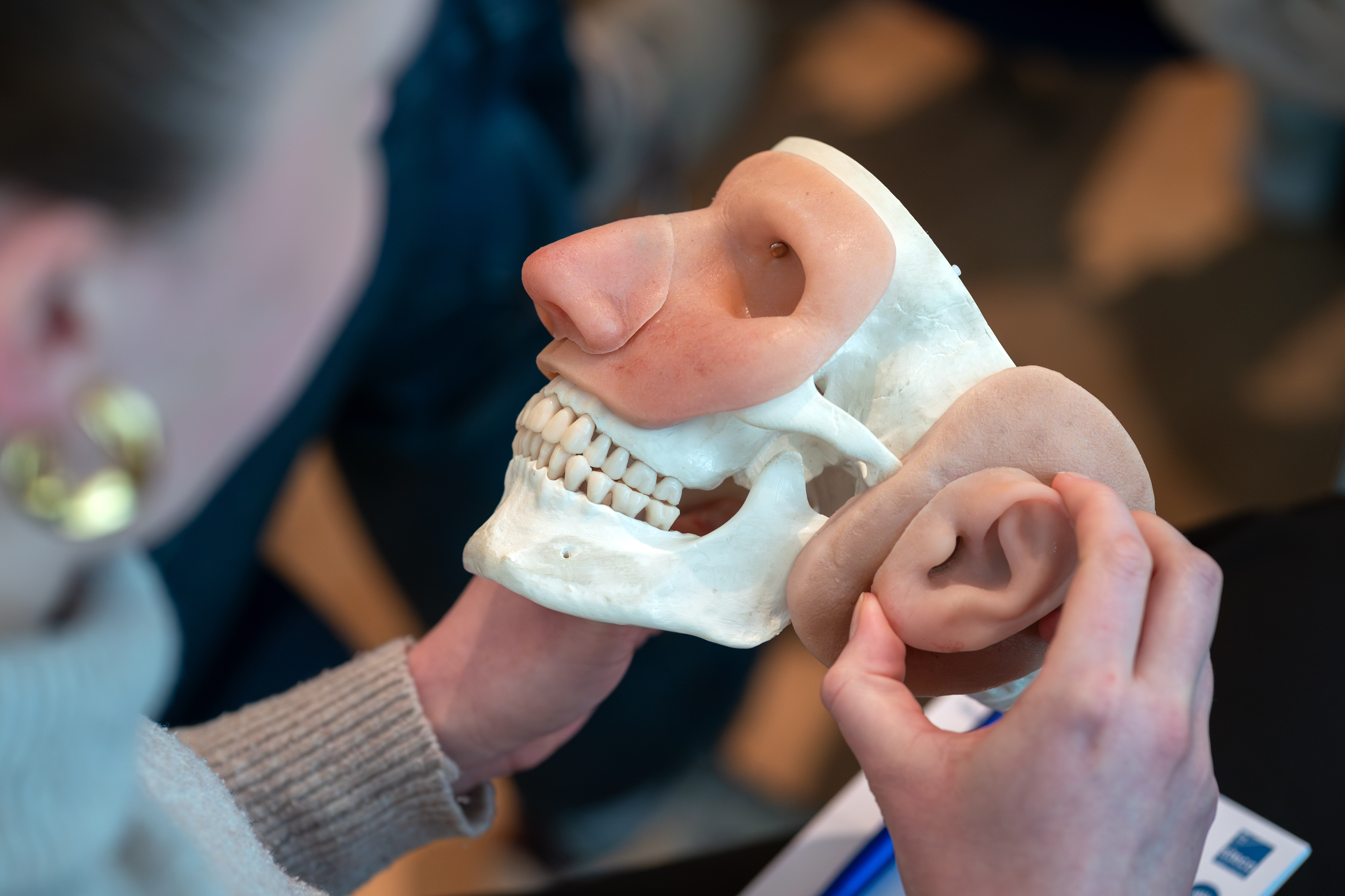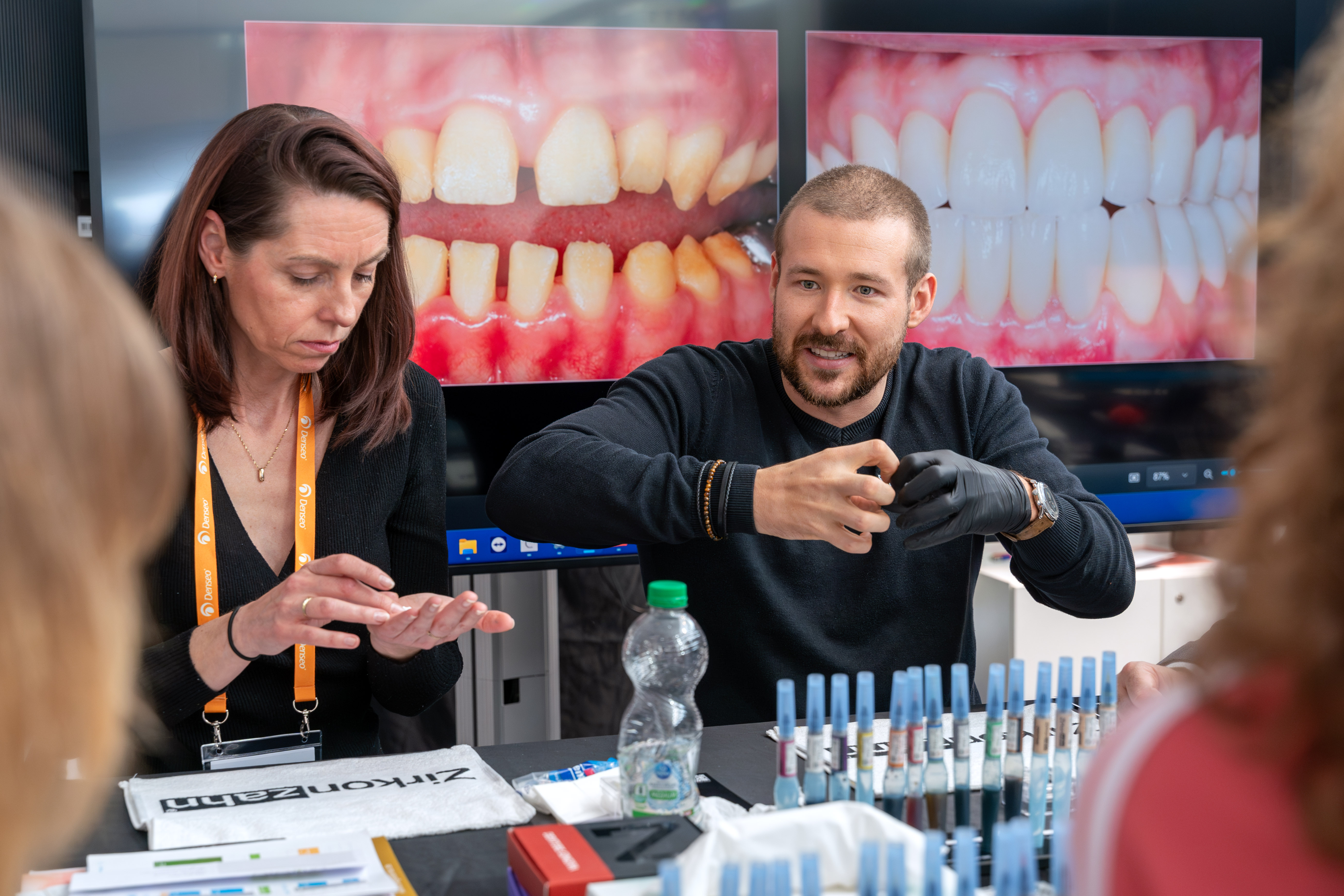 Eine Frau mit langen, lockigen Haaren in schwarzem Rollkragenpullover zeigt einem Mann mit Bart ein Zahnmodell auf der Messe zahntechnikplus