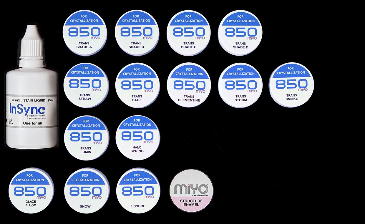 - 850 MiYO Halo: Semi-opake Paste mit reduzierter Fluoreszenz zur Nachbildung des typischen Halo-Effekts im Inzisalbereich.