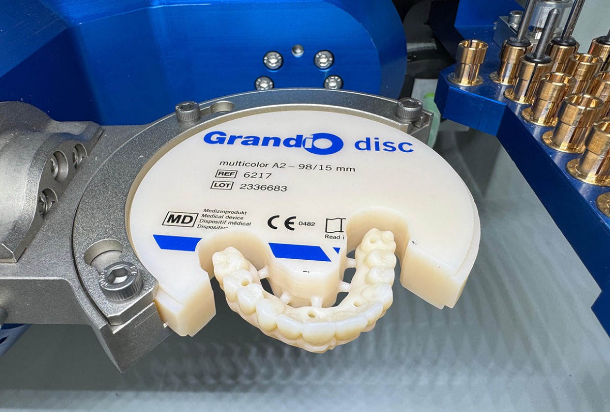 Mit der aktuellen Indikationserweiterung erschließt VOCO für die Fräsrohlinge Grandio disc multicolor und Grandio disc einen neuen Anwendungsbereich in der digitalen Zahntechnik: Das nanokeramische Hybrid-CAD/CAM-Material ist nun auch für die Verblendung tragender Gerüstkonstruktionen zugelassen. Damit geht der Einsatz über permanente Einzelzahnrestaurationen hinaus und eröffnet neue Freiheiten bei Teleskoparbeiten, Stegkonstruktionen und großspannigen Implantatversorgungen. Grandio disc bietet Zahntechnikern und Zahnärzten eine flexible, ästhetische und wirtschaftliche Lösung für hochwertige prothetische Restaurationen. Effizienter Workflow von Labor bis Praxis Dank seiner Materialeigenschaften ermöglicht Grandio disc einen deutlich verkürzten Workflow: Brenn- und Glanzbrandprozesse entfallen, das Material wird lediglich poliert und bei Bedarf verblendet. Das spart Zeit, erhöht die Wirtschaftlichkeit und macht One Day Dentistry noch attraktiver. Hohe Kantenstabilität beim Fräsen verhindert Abplatzungen und reduziert Wiederholungsfräsungen. Die gute intraorale Bearbeitbarkeit und Reparierbarkeit sorgen für zusätzliche Flexibilität. Mehr Tragekomfort für Patienten. Bei umfangreichen Versorgungen überzeugt Grandio disc durch sein geringes Gewicht – bis zu zwei Drittel leichter als Zirkon. Das erhöht den Tragekomfort und die Lebensqualität der Patienten. Die dentinähnliche Elastizität wirkt Spannungen entgegen und reduziert das Risiko von Chippings, wie sie bei starren Keramikverblendungen auftreten können. Grandio disc ist ein nanokeramisches Hybridmaterial mit 86 % Füllstoffgehalt. Es erreicht Festigkeitswerte vergleichbar mit Silikatkeramiken, ist antagonistenfreundlich und zeigt ein zahnähnliches Kaubelastungsverhalten bei geringer Abrasion. Die Indikationen umfassen Inlays, Onlays, Veneers, Kronen, implantatgetragene Kronen sowie die Verblendung tragender Gerüstkonstruktionen.