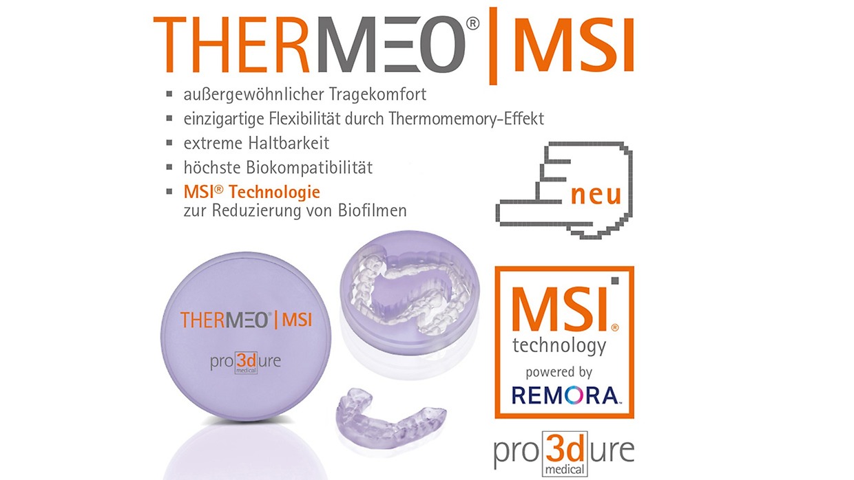 Die hunderttausendfach bewährte THERMEO® Ronde gibt es nun auch als MSI® Variante (Multi Species Inhibition). Damit ist Sie die weltweit erste biomimetische Fräsronde ihrer Klasse, welche durch pro3dures einzigartige MSI® Technologie die Adhäsion von Biofilmen im Mundmilieu auf natürliche Art und Weise reduziert. Es wird dabei ein natürlicher Prozess kopiert, wie er z. B. von der Rotalge Delisea genutzt wird. Ein im Dentalmaterial verankerter Naturstoff (Lactam) stört die Kommunikation von Bakterien, das sogenannte „Quorum Sensing“. Dadurch wird die Biofilmbildung signifikant reduziert bzw. deren Anhaftung. Dieser Effekt ist nicht auf antibakterielle Zusätze zurückzuführen, die ggfs. zu Bakterienresistenzen führen können. Im Zuge dessen erzielt man eine verbesserte Mundhygiene und so weniger Irritationen des Weichgewebes gemäß dem Motto „Inspired by Nature, addicted to Function“.
