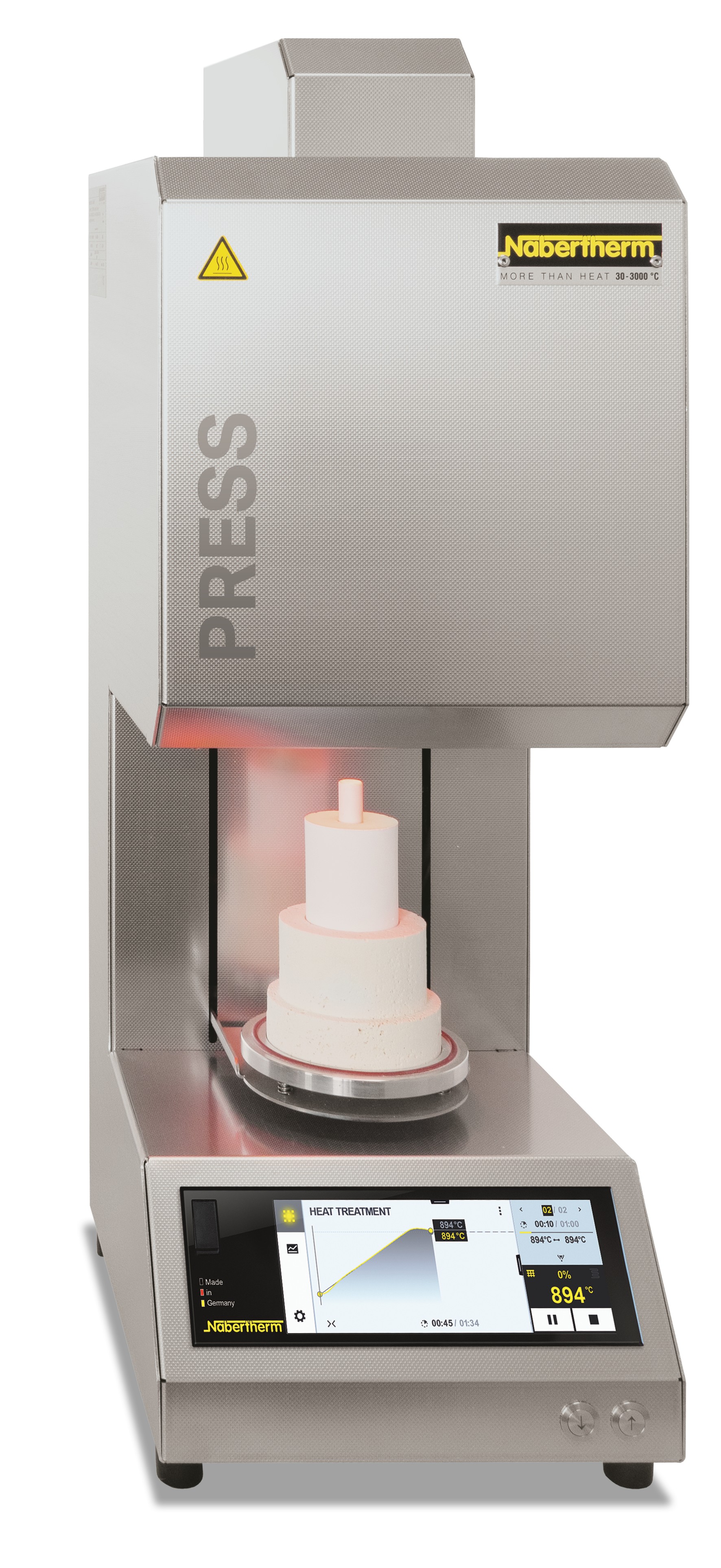 The vacuum pressing furnace VL 01/12 LB Press is ideally suited for firing of conventional ceramic veneers under normal atmosphere or vacuum but also for processing of all common pressing ceramics. The all-round heating of the furnace chamber results in a very even temperature uniformity and enables fast heat-up times. The lowerable, electric motor-driven lifting table ensures easy and convenient handling for the pressing process.